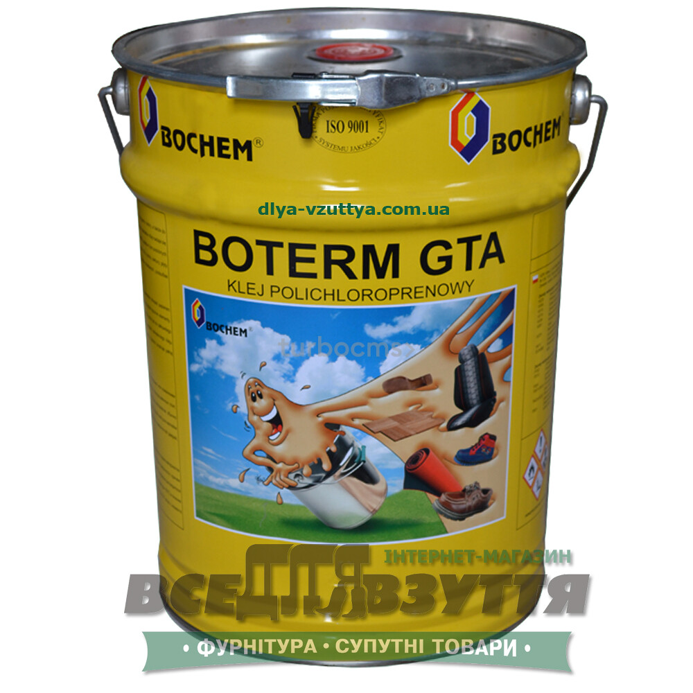 Клей BOTERM GTA предназначен для обувной промышленности, для склеивания резины с натуральной и синтетической кожей а также для вспомогательных операций м. пр. вклеивания подошв и межподкладок, выстилок и укрепляющих элементов. Употребляемый тоже в мебельной, автомобильной и строительной промышленности